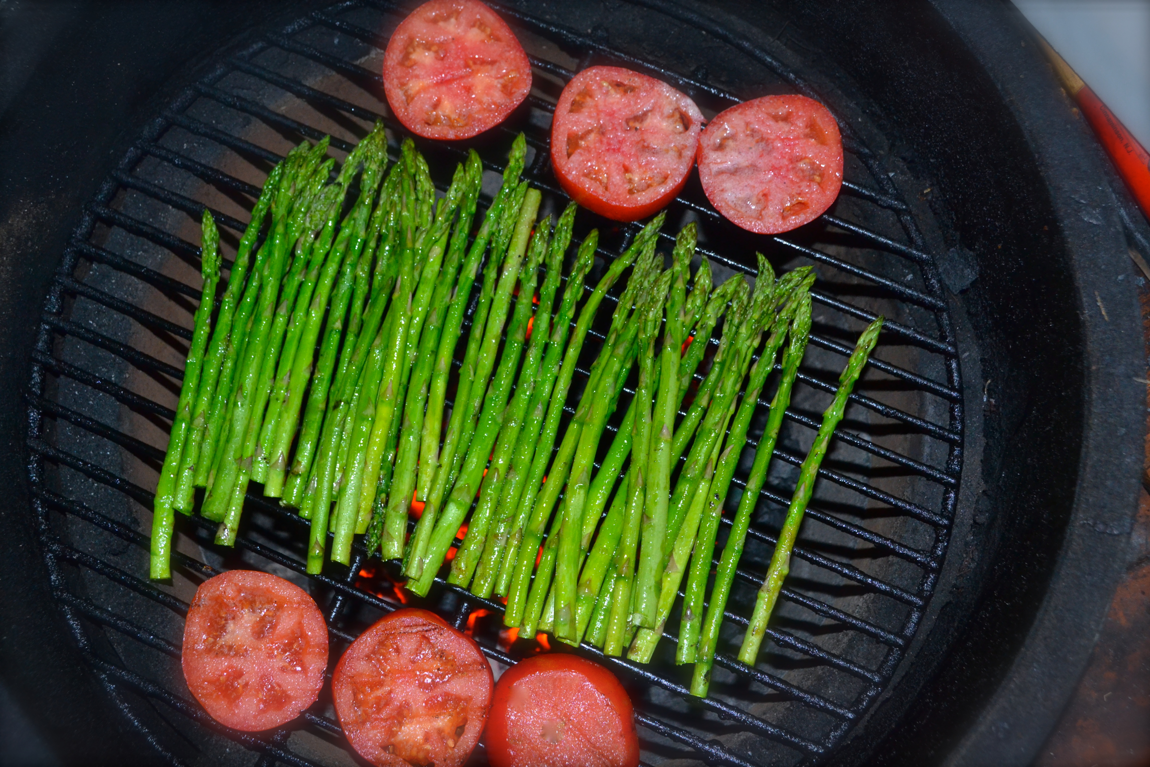 Cut your bread in 1/2 inch thick pieces. Set aside. Cut your tomatoes lengthwise into 1/2 inch pieces. If you do not have a grill available, you can roast the asparagus and tomatoes in the oven for about 15 minutes at 400 degrees. Turn them at least once. The taste of fire enhanced food is irresistible. Grill your tomatoes, asparagus and bread until lightly charred.