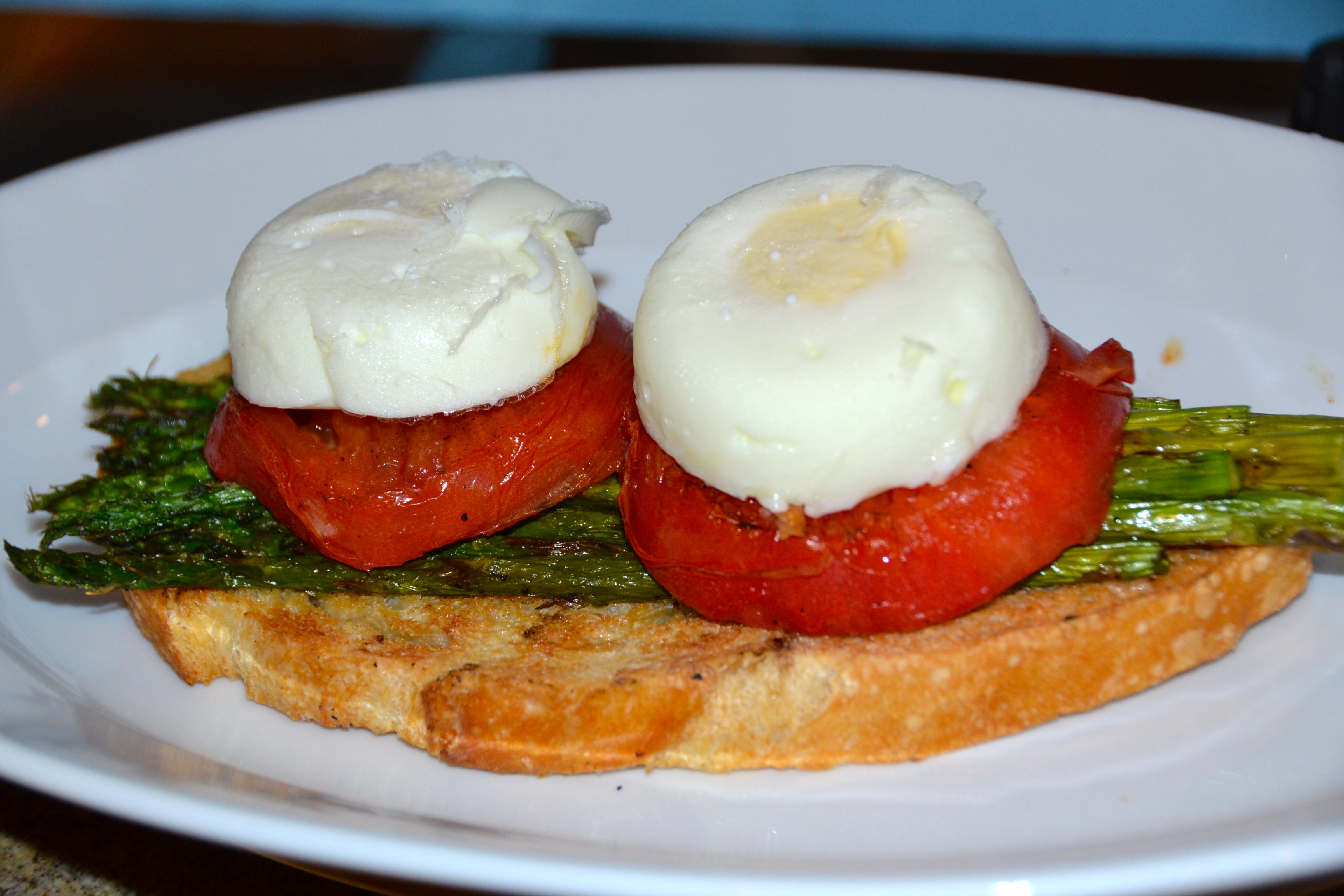 Easter is a close second to Christmas as far as celebrations in our family.  Spring is finally showing itself around here with blooming tulips and daffodils and the dogwoods are especially beautiful this year as the azaleas are barely beginning to show their bright colors as we observed today at the Masters.  Easter is around the corner and anxious to celebrate the season, it is time to prepare for Easter Sunday Lunch.  This twist on the traditional Eggs Benedict is layered with tomato and asparagus instead of the traditional ham. I like how it is lighter, fresher with the grilled asparagus and tomatoes and definitely more beautiful on the plate. And the bottom traditional English Muffin is replaced with a sour dough bread toasted on the grill. Toast is more popular than ever and if you bake your own, you will benefit from the enhanced flavors of homemade yeast bread. Our friend Elizabeth blessed us with a homemade bread that speaks to you of old world rustic ovens in France when you take a bite into its crust. This bread loaf is like gold and instead of fighting over who gets the last slice, this is an alternative to continue to share the love. DSC_0363