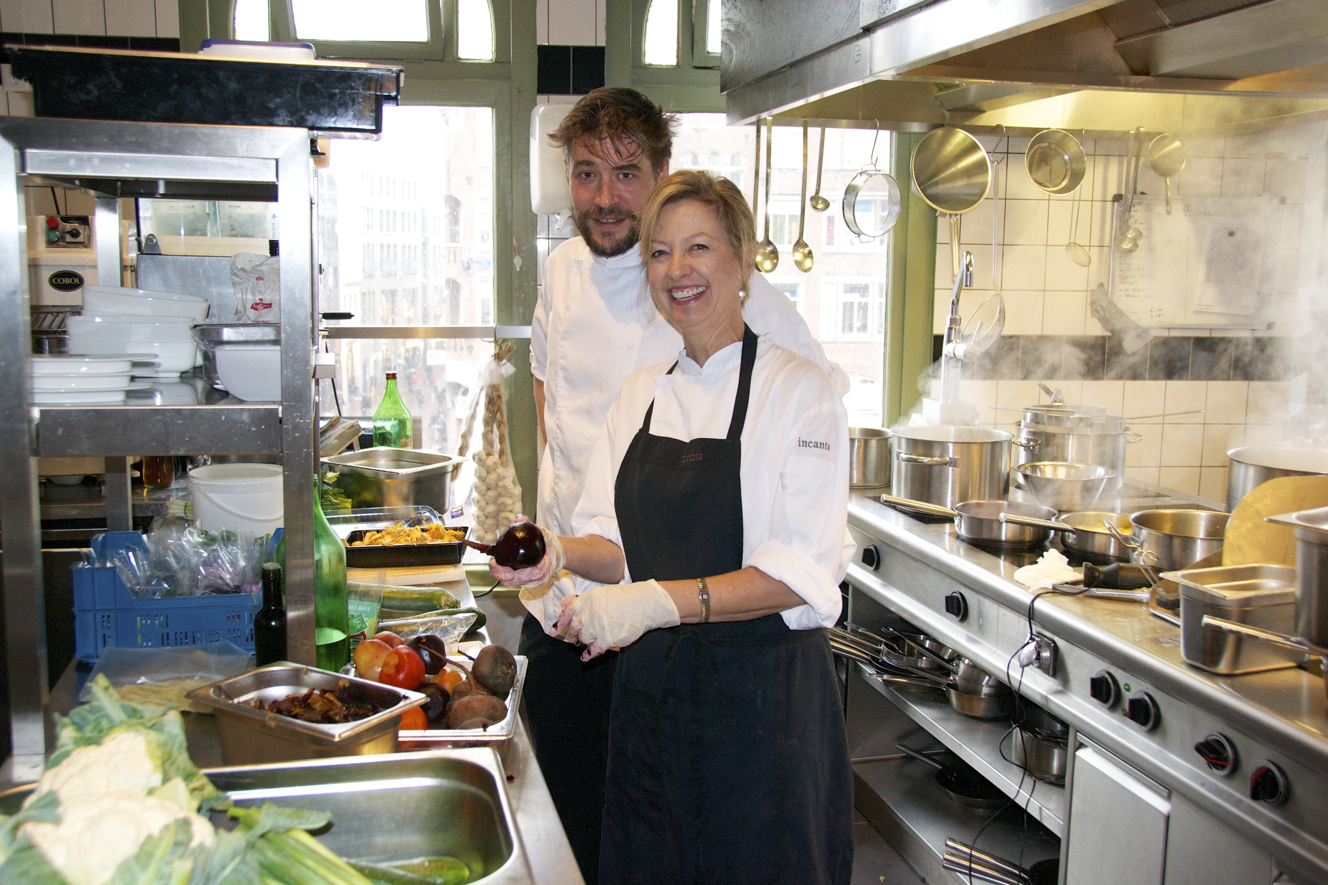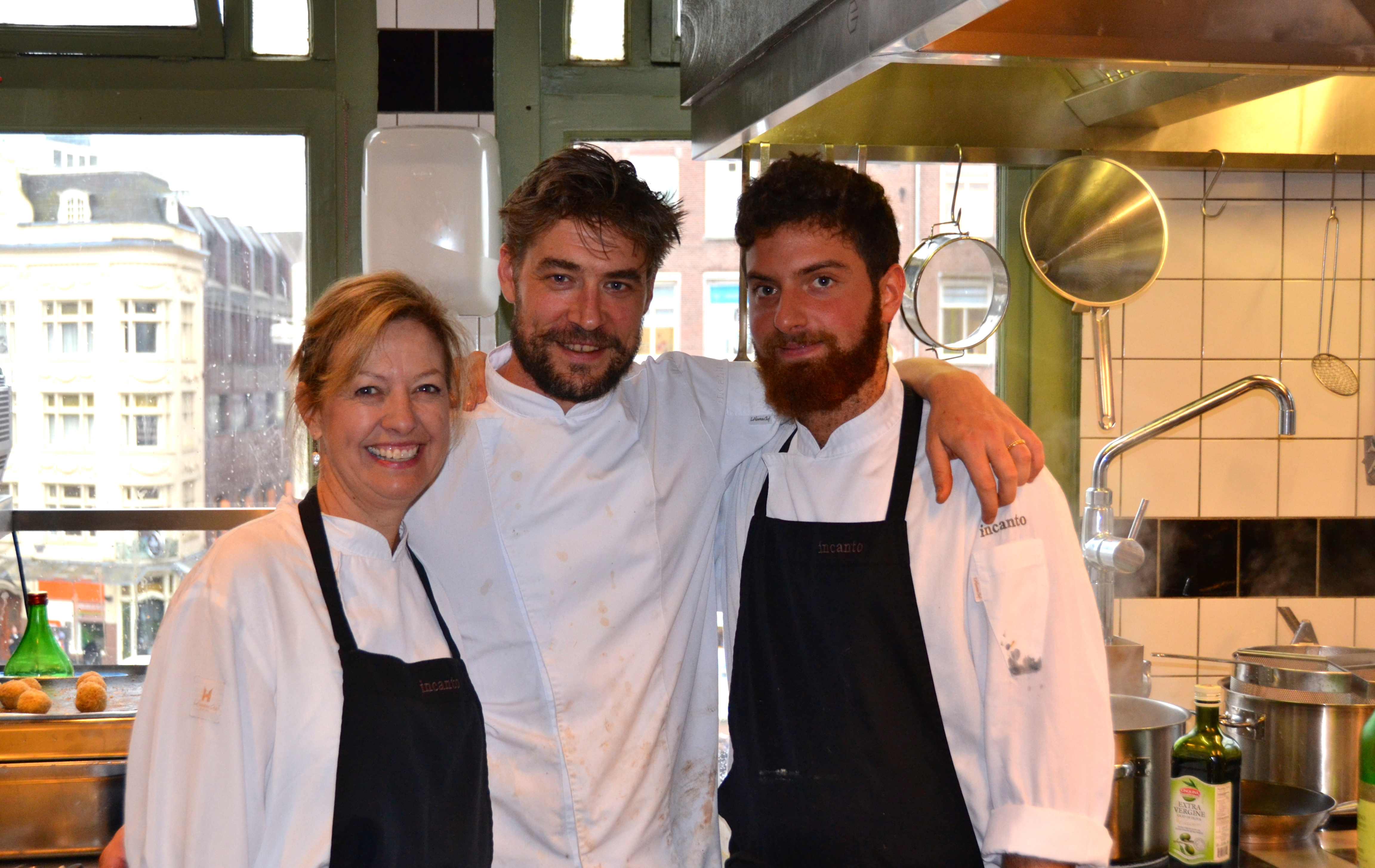 Privileged to prep with the chefs at Incanto in Amsterdam. This Italian restaurant is no simple Italian restaurant, located near Old Town, the flower market and ideally across from our hotel. I was fortunate to have the opportunity to have a “cooking workshop” to experience their mise en place for dinner that evening. Expert chefs Bas Schippers and Nicola Rossi were gracious and immersed me in their busy kitchen prep. The quality and freshness of the food in this kitchen were beyond impressive. Two kinds of fresh mozzarella were delivered, three types of homemade bread were being made, fresh pistachio ice cream churning and I stood amidst turnips, fresh herbs, garlic, beets, and beautiful tomatoes.