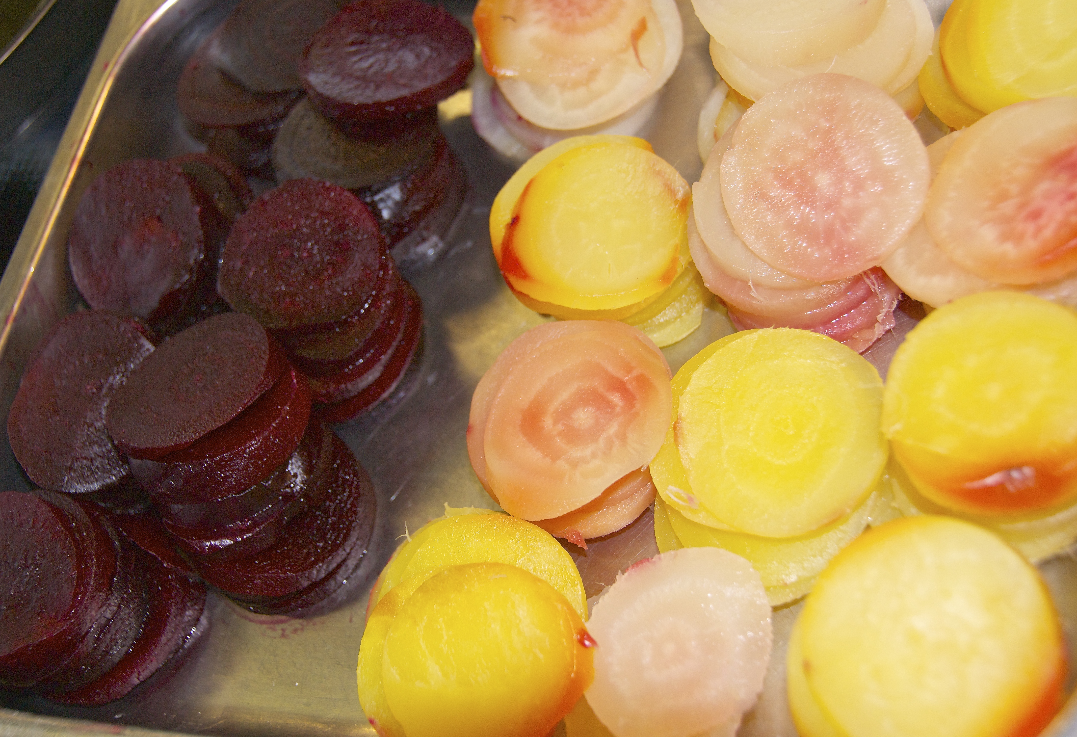 I peeled the roasted and cooled beets. It is surprisingly simple to rub the skins off once they are cooled. Because the rich ruby color of the beets tints everything it touches, I wore gloves and kept them separate from the golden beets so they could retain their color before slicing them.