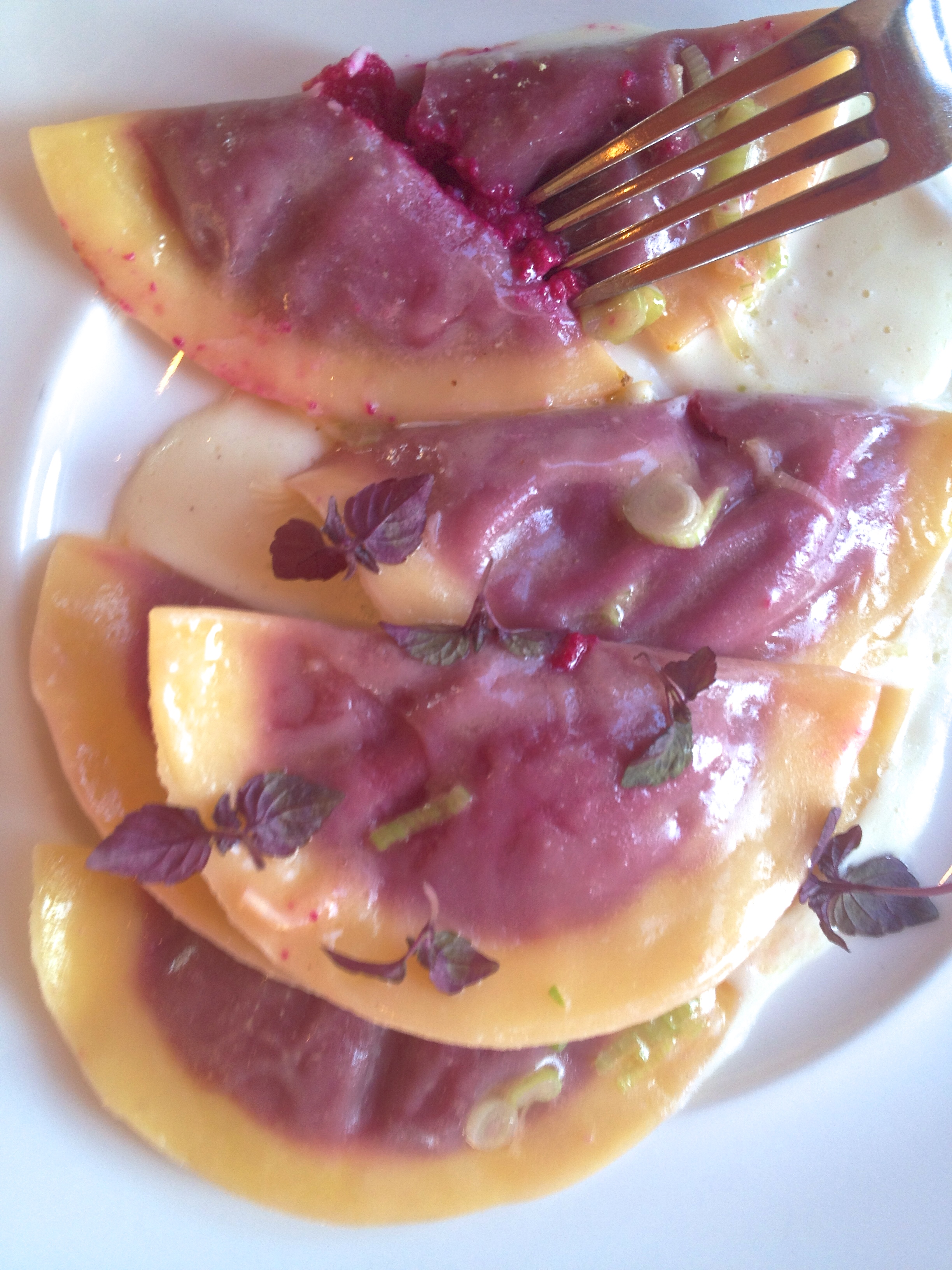 Later for dinner Chef Bas created a handmade ravioli filled with beets over a light cream sauce and topped with slices of green onion and herbs. The simplicity and slight sweetness of the ravioli melted in my mouth.