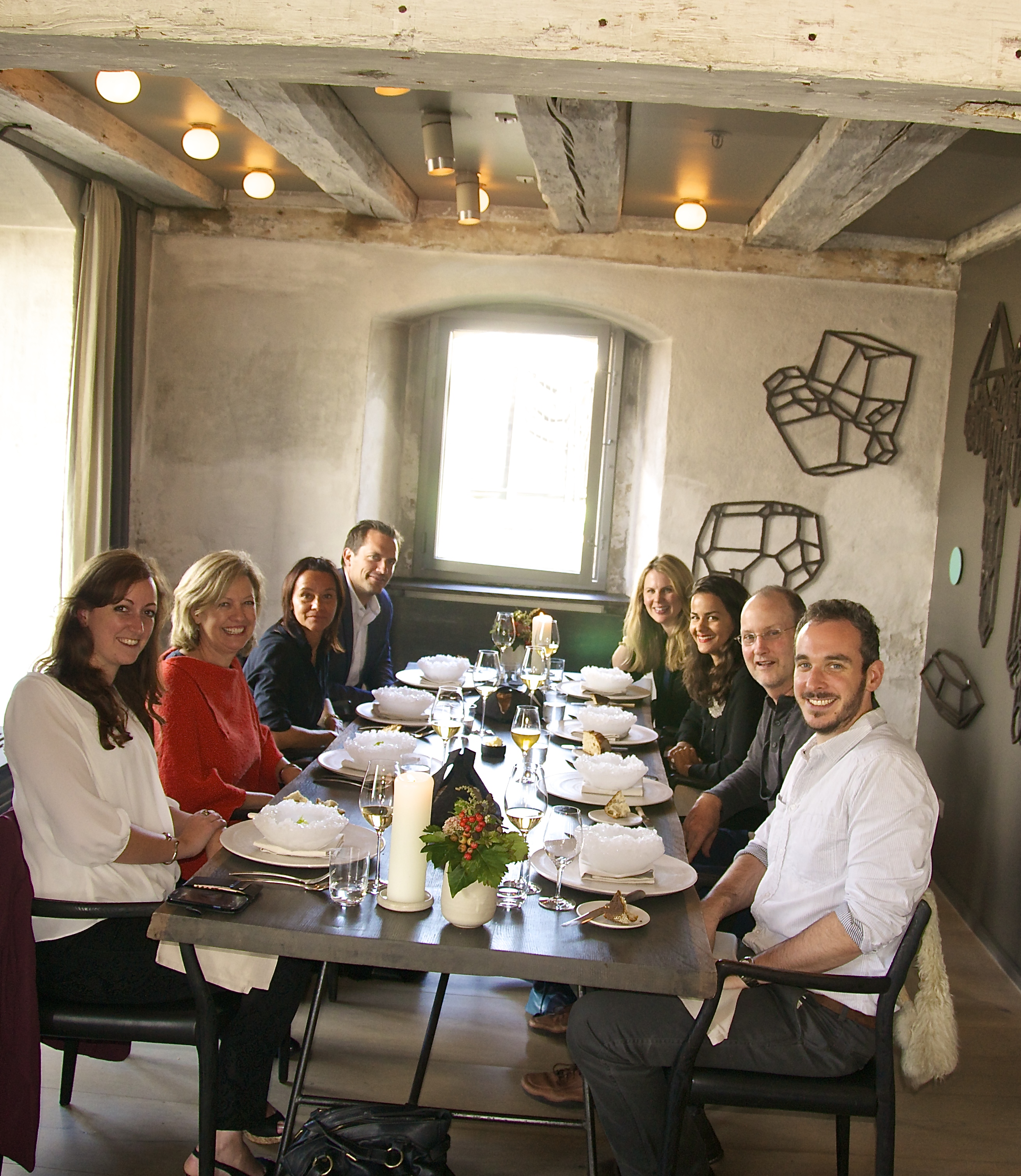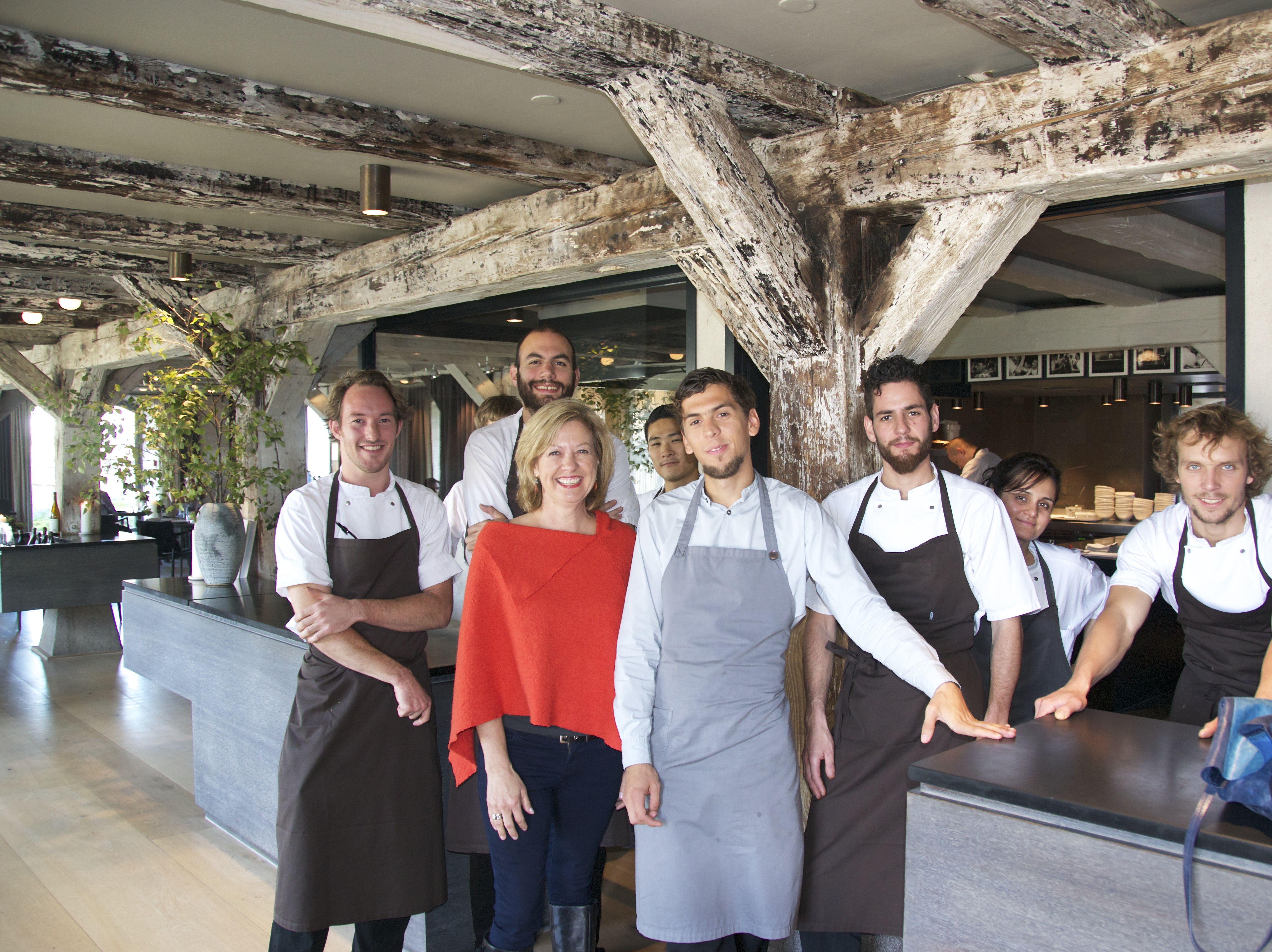 Upon entering the restaurant for “the” seating at 12pm, we were greeted with broad smiles by at least ten of the staff each wearing smoky grey aprons standing at the entrance amongst dramatic rugged wood columns. The ambience was clean and tranquil with soft lighting and chairs that were made more comfortable with genuine fur blankets draped over the backs. You felt like you were eating in a friend’s dining room. Our chunky wood communal table sat eight where we were a global and gregarious group from Zurich, Ireland, London, Georgia and Minnesota. One of the couples, Ben and Ellen had just flown in from London for a surprise celebration for Ben’s 30th birthday!