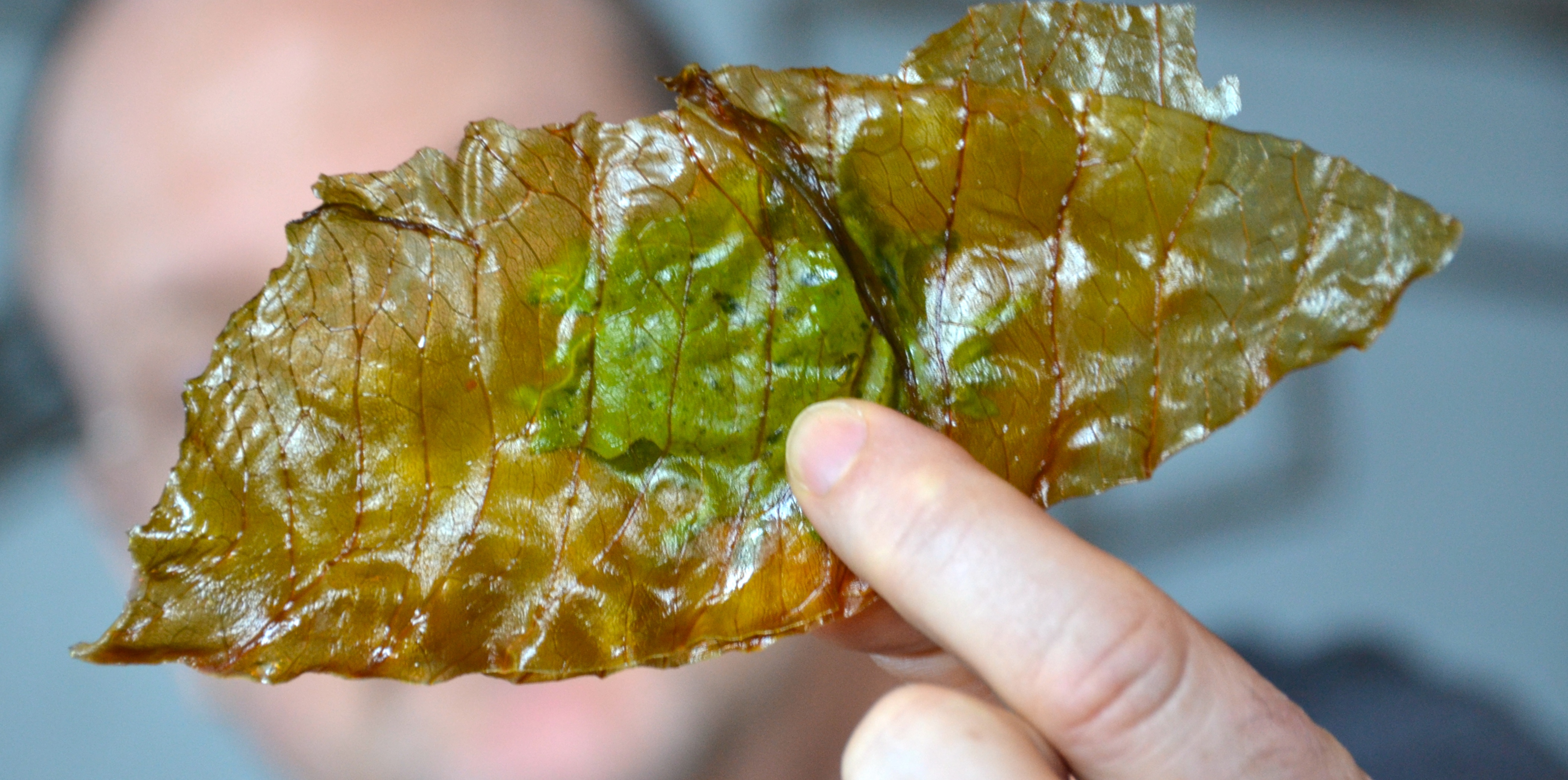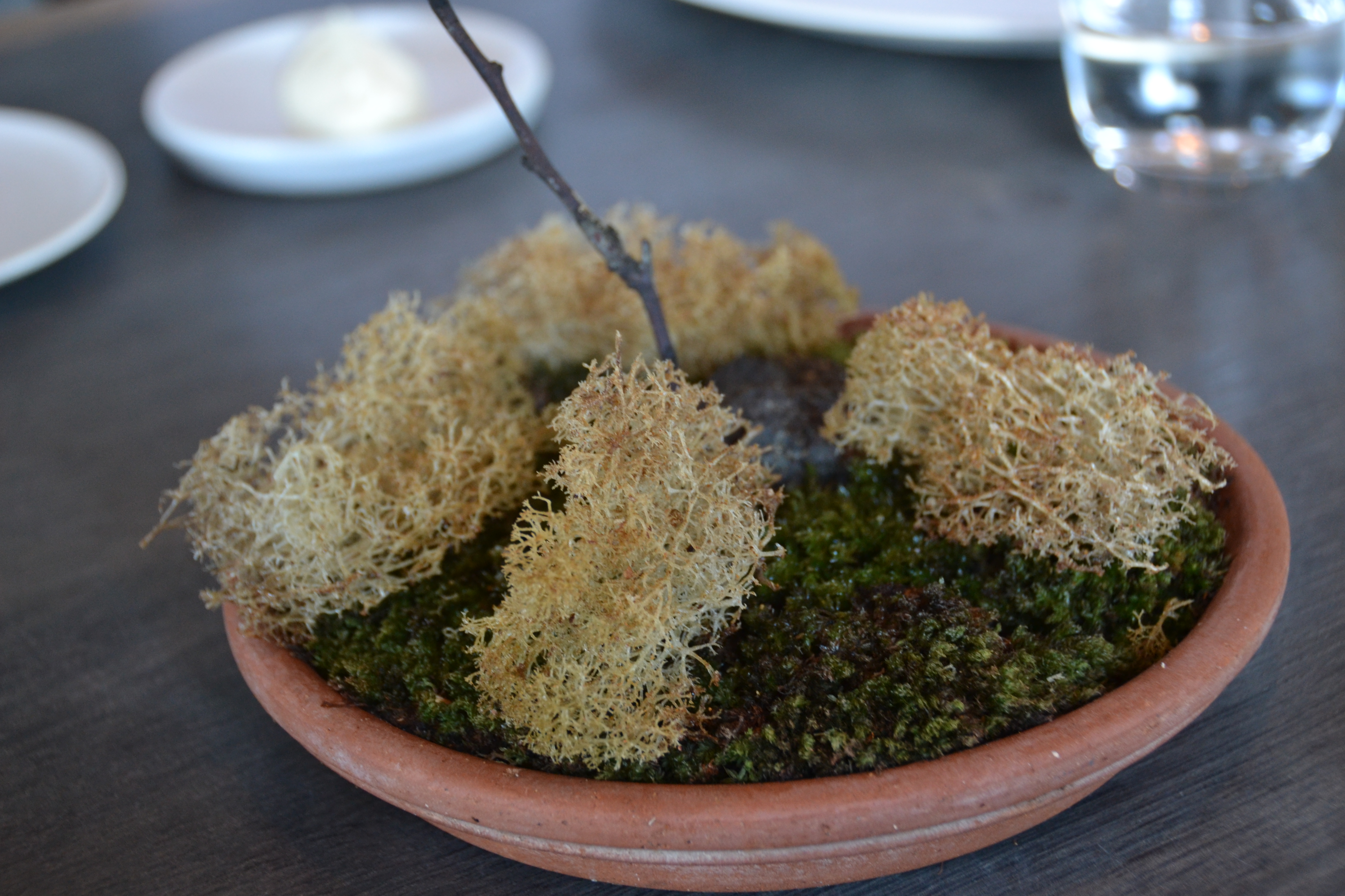 Once we were all seated the food began to descend. The opening dish was a small clay bowl bursting with berries that built anticipation for the 20-plus courses ahead. It beautifully reflected reds and greens of red currants and other indigenous berries. The second dish arrived quickly with a presentation of deep-fried reindeer moss. Mounted carefully on a bed of greens, for a moment you felt like you were alongside a reindeer discovering this beautiful source of protein attached to a birch branch foraging in the forest. A thick dipping sauce made of yeast and whey was provided as a side. Whey is a byproduct from making cheese or yogurt. It added a bit of saltiness and acidity to the reindeer moss, just as you would expect.