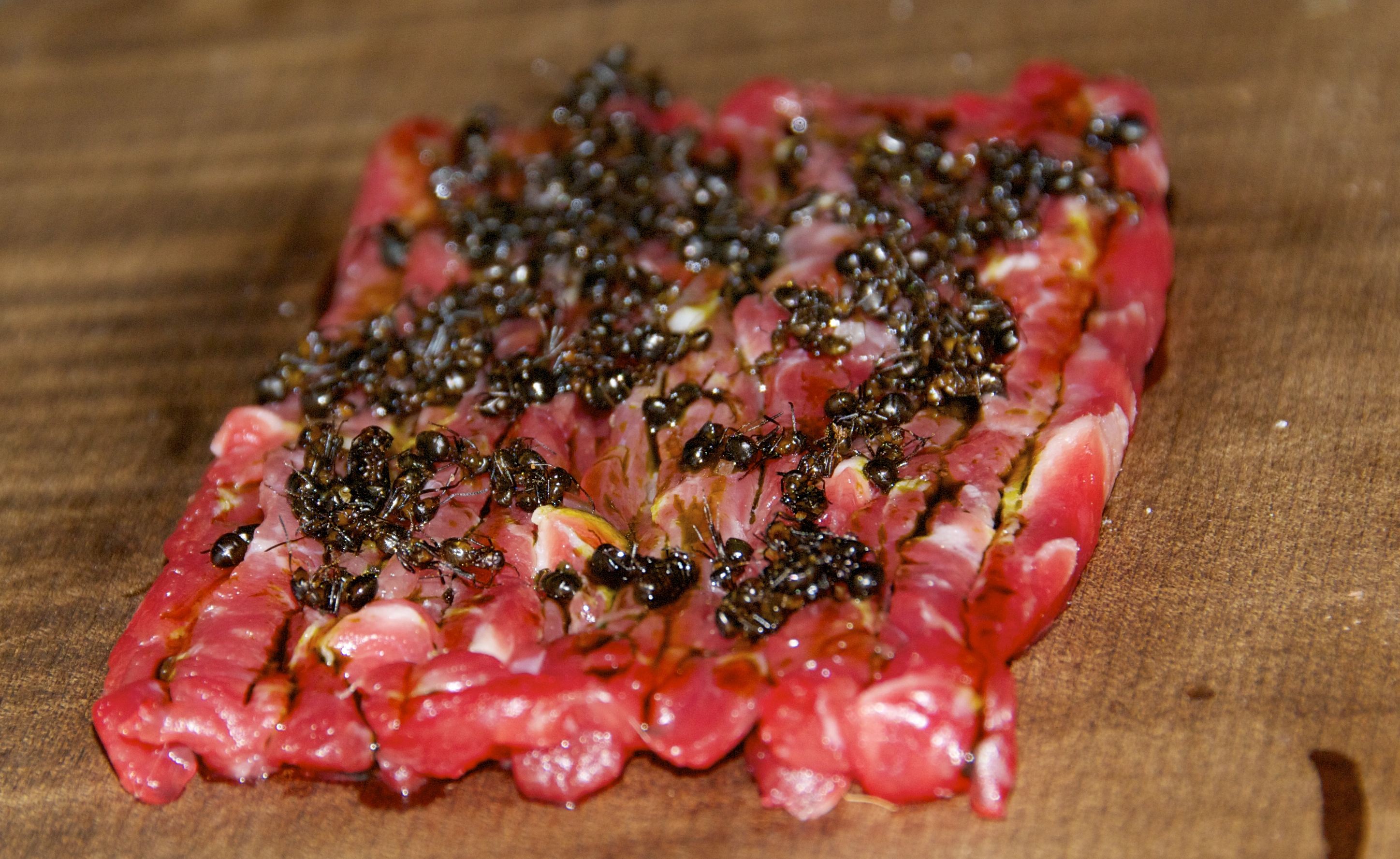 Moving along at a brisk pace, we were presented with beef tartare covered in a black coating. As we looked closer, we discovered that the “coating” was ants. We were told that ants add a nice peppery protein-filled crunch and definitely a different perspective. What use to be kale, then beet greens, bugs now appear to be the new food trend.
