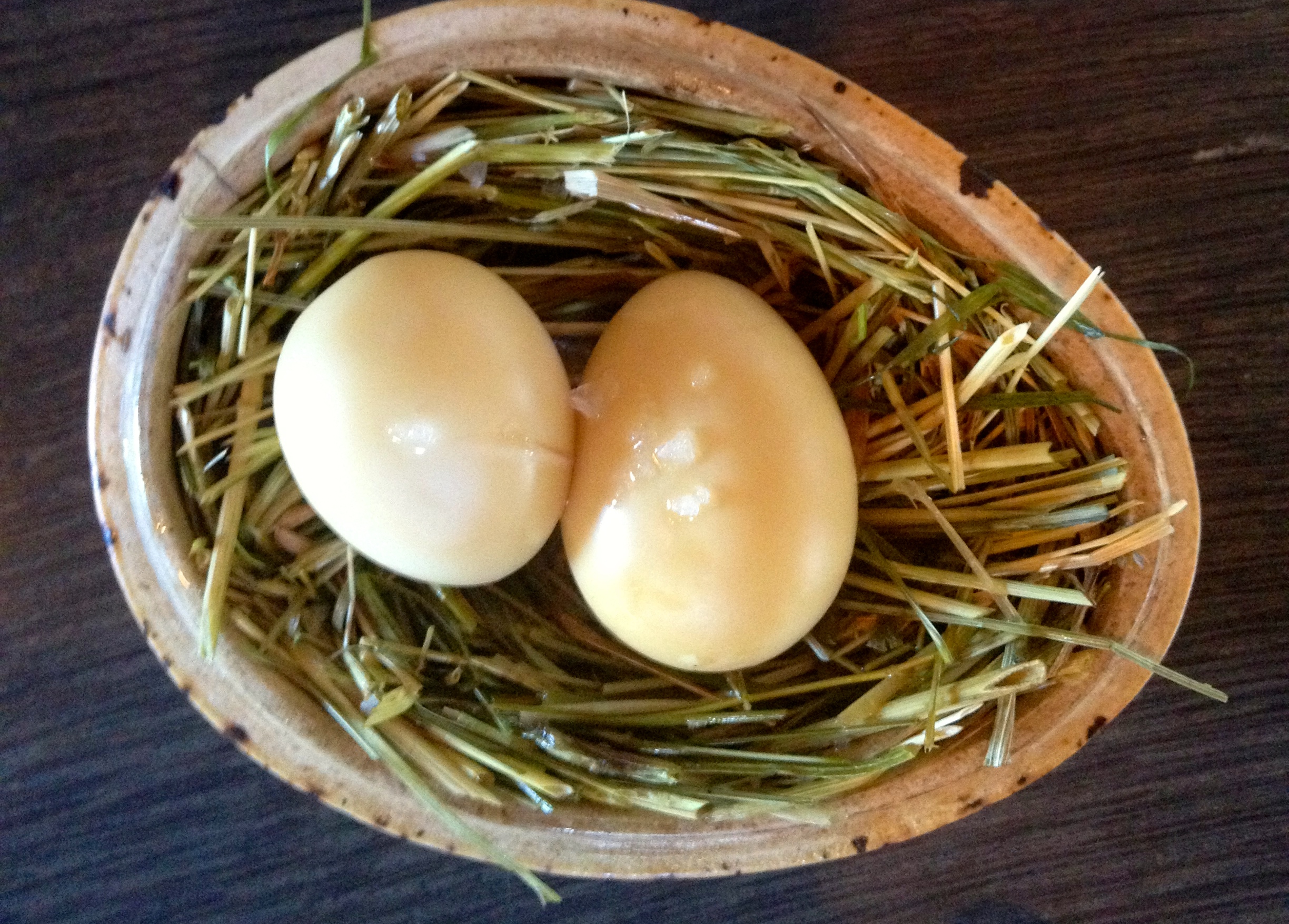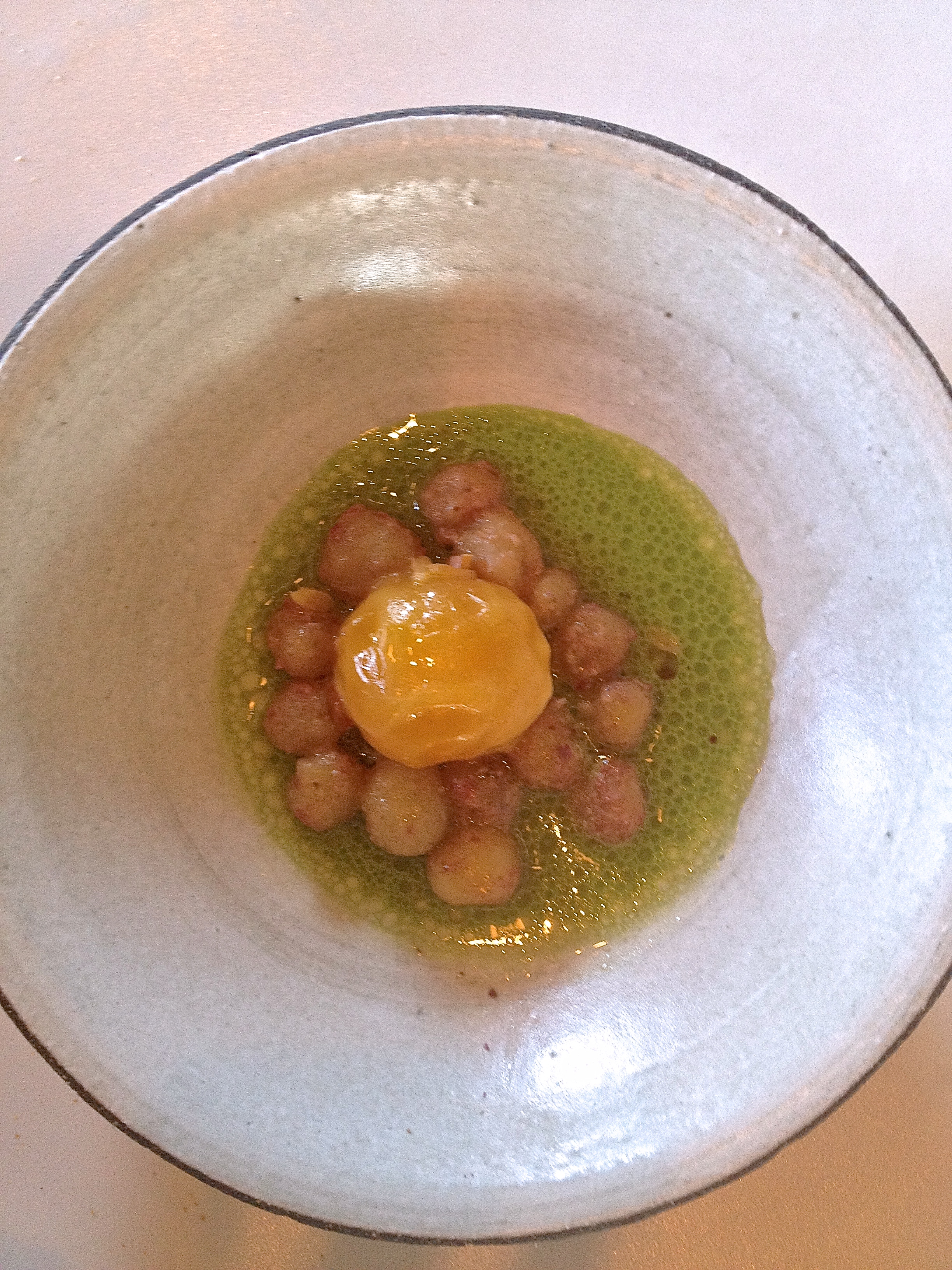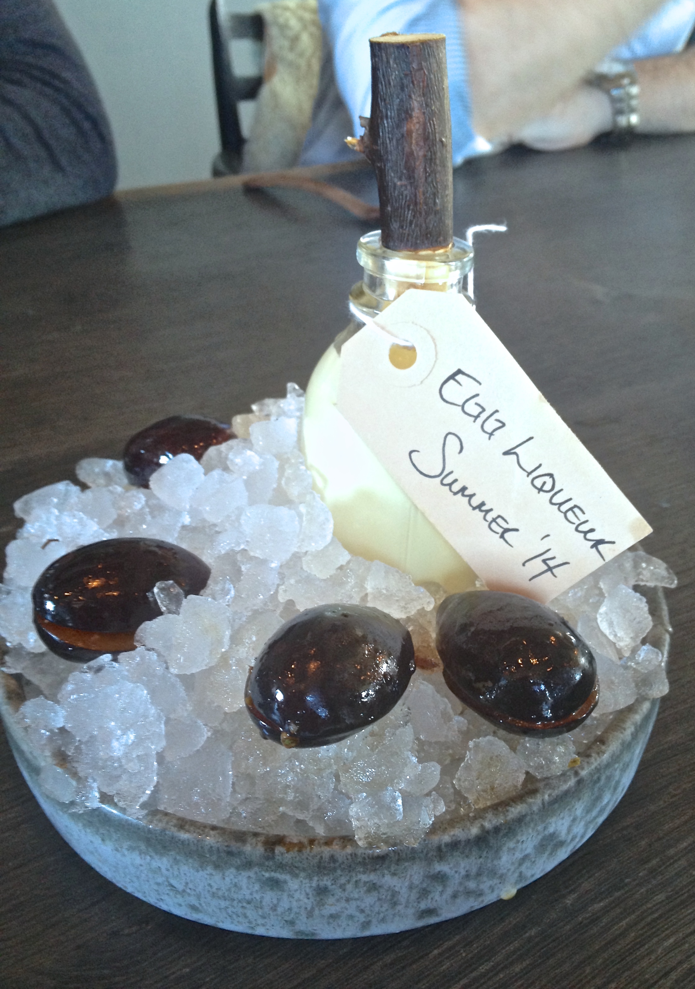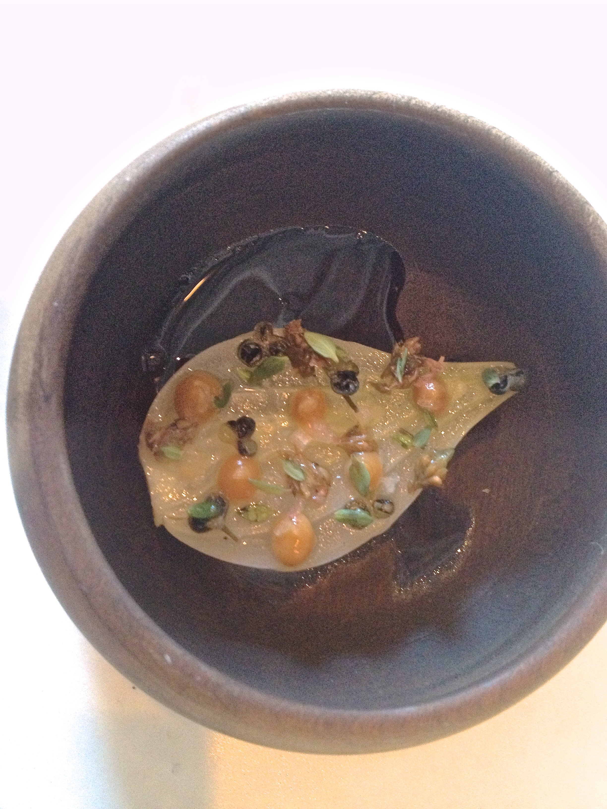 There is clearly an ethos enveloping each dish of resourcefulness, minimalism, maximum flavor and ingenuity. Each plant, its leaves, stems, and even the bristles are acknowledged for the flavor they bring to complement each unique dish. We all marveled at the presentation of each dish. The adjectives seem inadequate. Clearly creative expression, integration and respect for the natural and local produce of the nordic region are rewarded here. Simple smoked quail eggs pickled in a bed of hay.