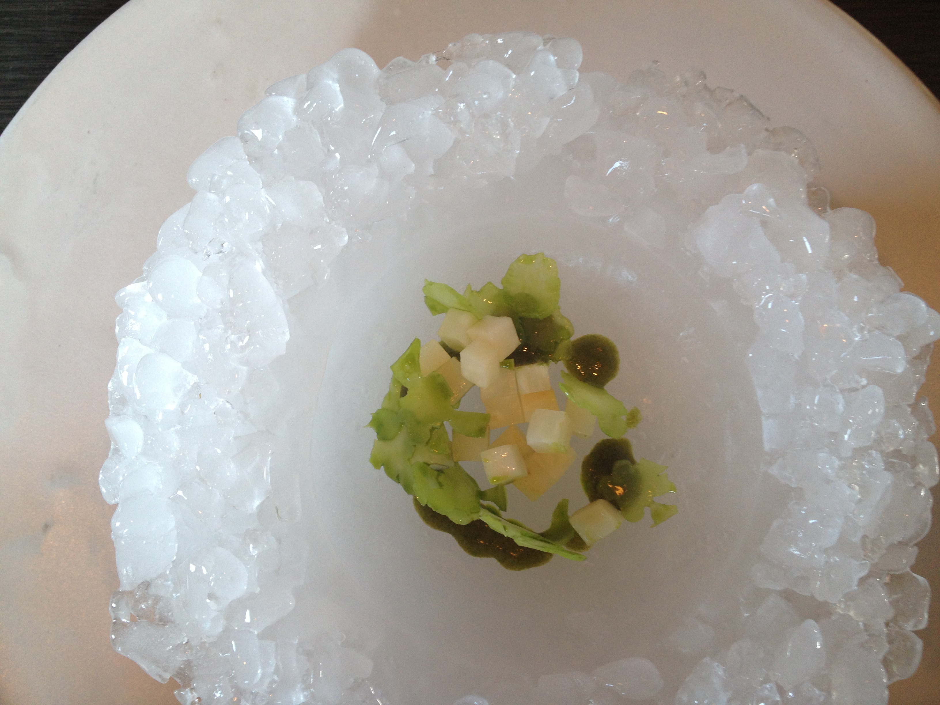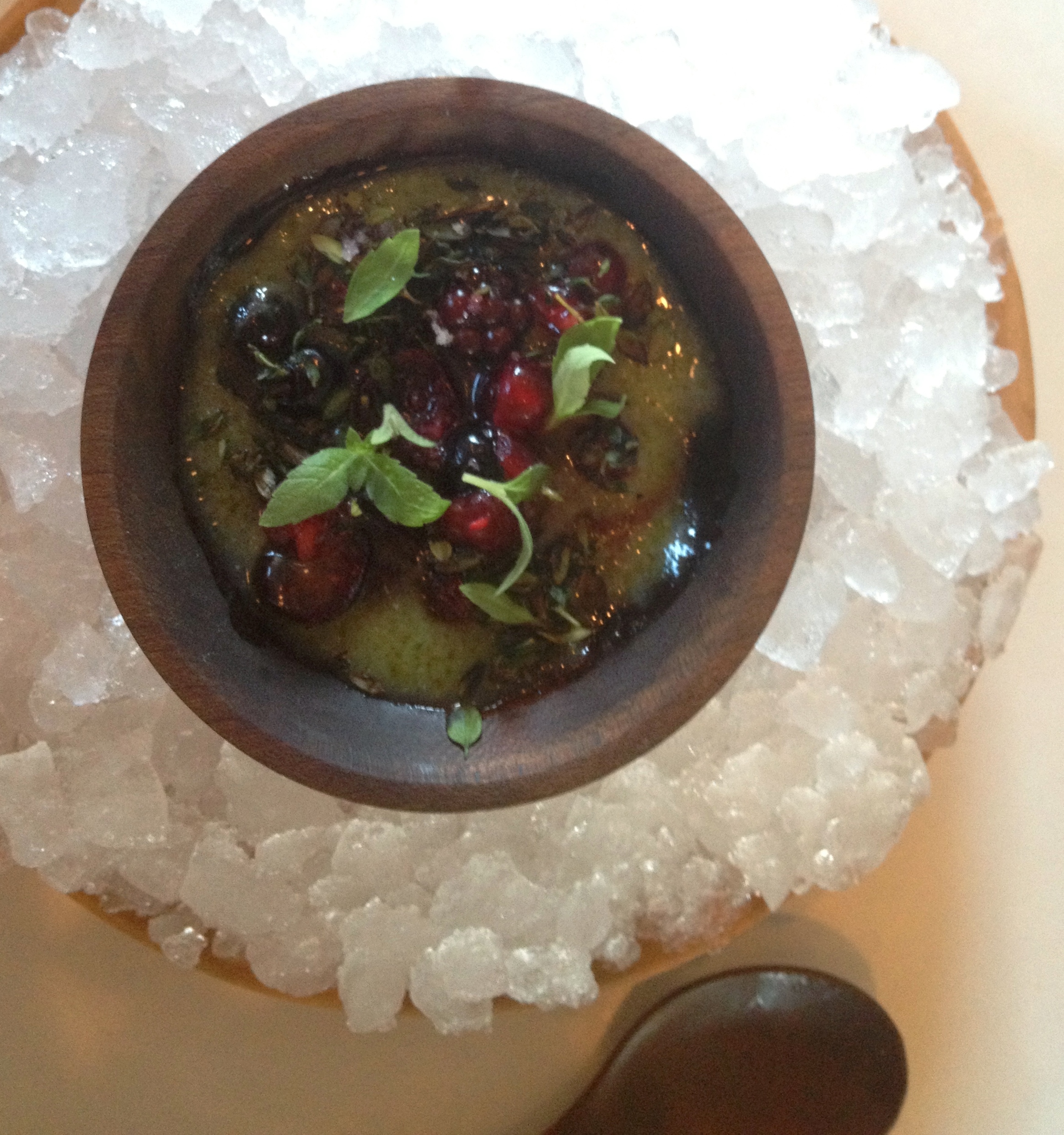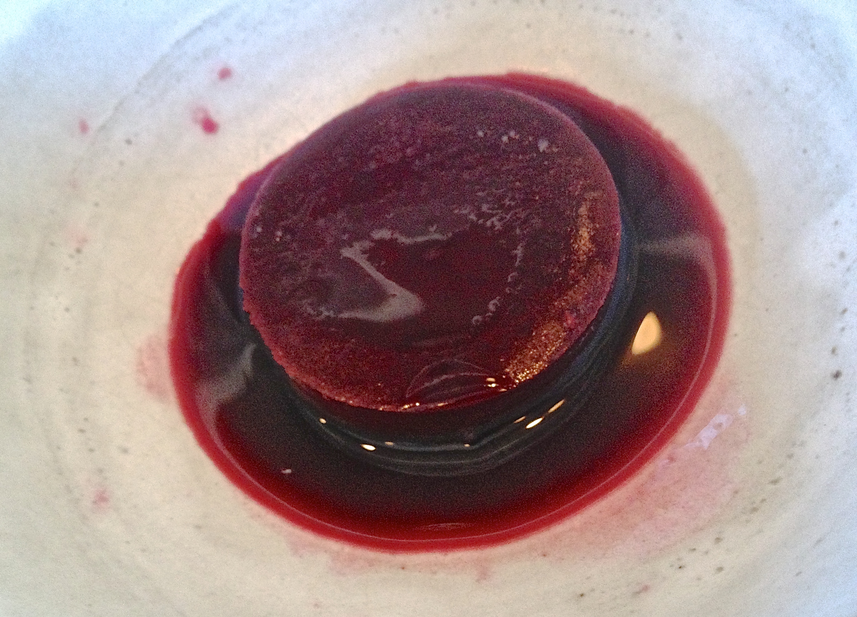 The beet looking dish played tricks on my taste buds as my mind said, “beet” but my tongue said, “raspberry with a bit of saltiness” with seaweed ice cream inside and a fruit jam in the bottom center. Exqisite contrasting flavors.